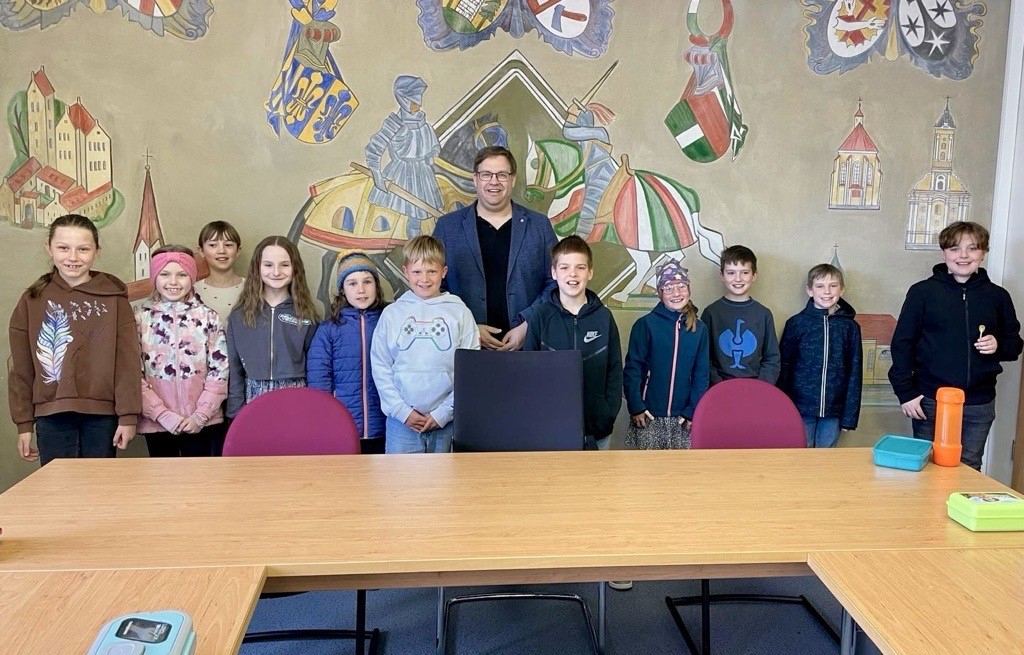 Am 21.4.26 besuchten die beiden 4. Klassen den Bürgermeister Stefan Scheider im Rathaus. Im Sitzungssaal erzählte er uns viel über die Aufgaben der Gemeinde und die Vorhaben: z.B. über den Hochwasserdamm, den Schutz der Haselmaus, über die Erneuerung der Kläranlage und die Wasserversorgung. Das wird alles viel Geld kosten. Er berichtete auch, dass er nur in etwa fünf Abende im Monat zu Hause ist. Er beantwortete uns noch alle unsere Fragen.